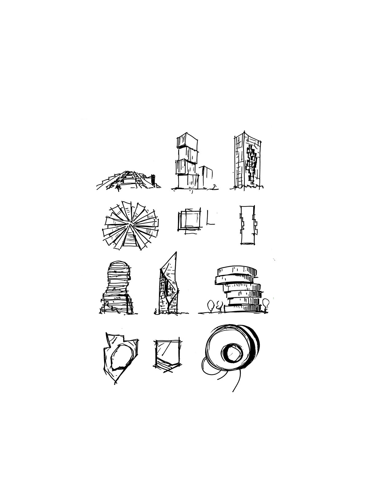 The structure combines office, retail, residential, and hotel space to represent the dynamic urban life of the city.