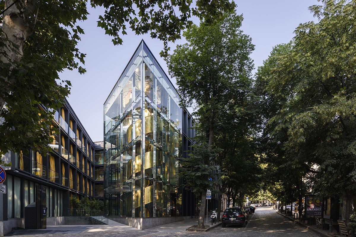 The newly-added completely transparent volume adds a new dimension to the street and the existing building.