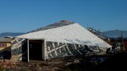 Since stones {and other objects} are constantly thrown, a ceramic-mosaic finish is projected; acting as an easy to repair, cheap, already broken wrapping, but also following a millenary religious technique.