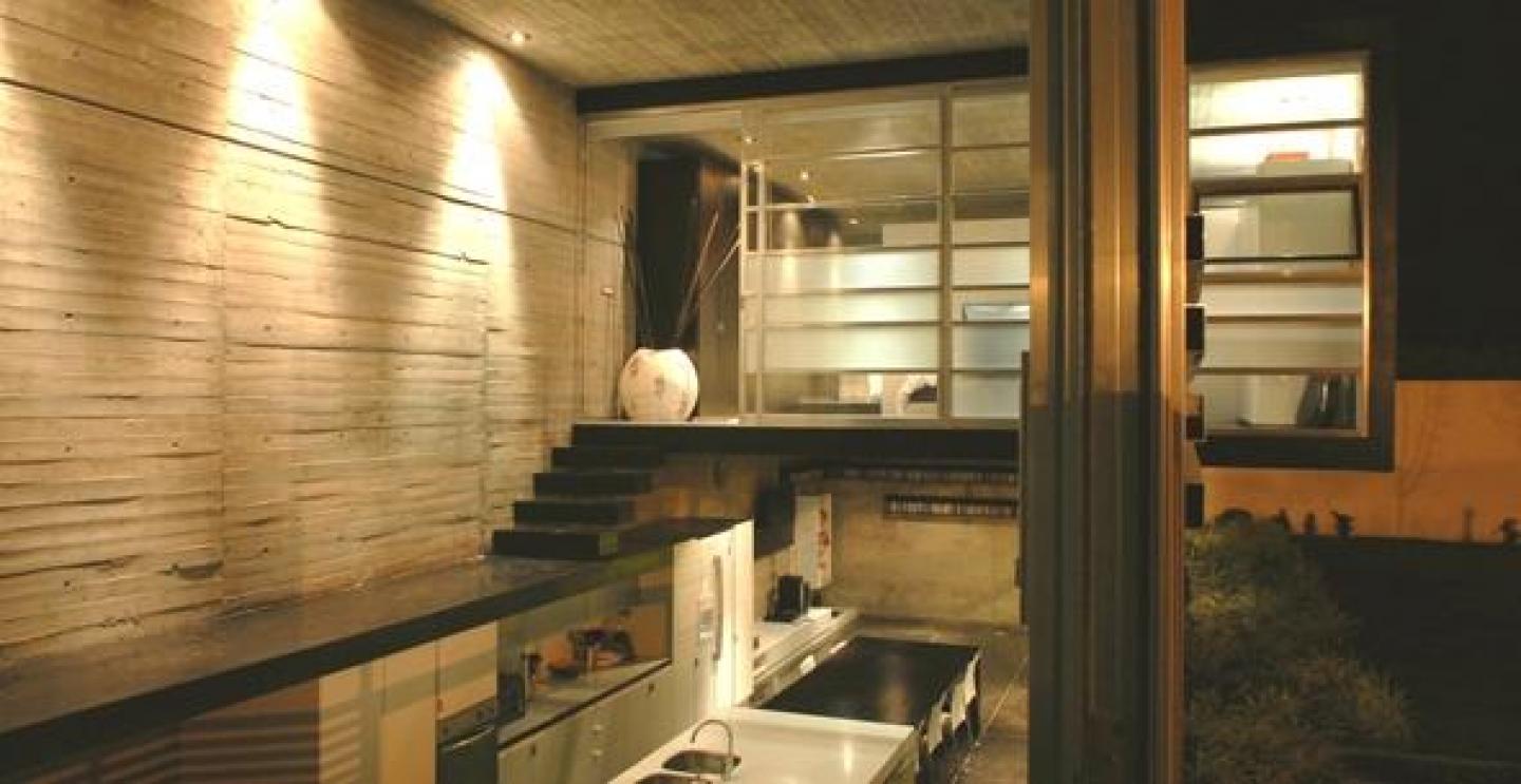 The empty space in one-and-half-height changes when one start to descend. The kitchen countertop emerges from the stair steps and faces the dinning room and the end of a more intimate and dim living room.