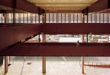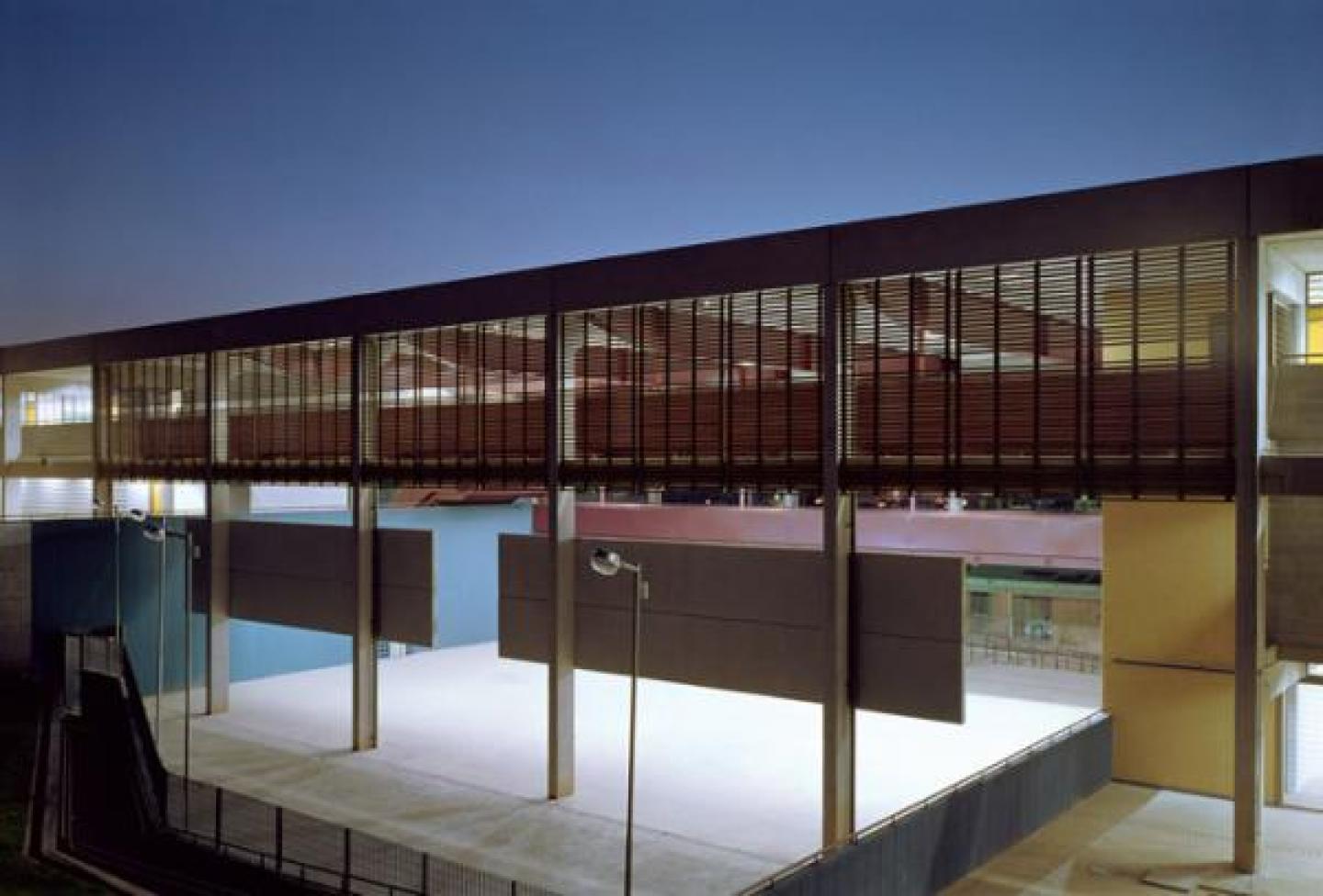The classrooms are disposed in a unique elevated level, with perimetral accessing galleries at east and west façades. These galleries show the surrounding landscape, and reveal the internal spaces of the school as well. This level passes over the entire extension of the site as a horizontal volume above the three different plateaus of the ground level. The volume interrupts itself when it passes over the soccer field, creating an empty gap. This empty space is surpassed by metallic bridges, sustained by the iron beams of the roof throught a system of steel tie rods. The longitudinal façades and these bridges are protected by wooden panels that minimize the effects of sun incidence and rain.