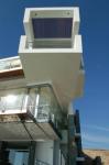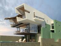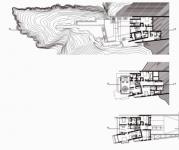Sand garden roofs act as the extension of the desert. Lap and recreation pools connect the ocean with the house. A huge cantilever imitates the jutting profile of the rock cliffs, while a glass box hangs lightly from its strength, symbolizing the architecture between sand and water.