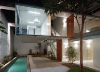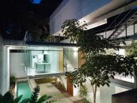 The house is divided into two levels, both below the street level. Its spaces are integrated with the woods, valley, gardens, and pool located at the ground level. The house incorporates the outside nature indoors: a sliding glass door opens the living room into the terrace,creating one large space. The bedroom and the patios can also be integrated at the lower level.