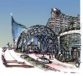 The hotel and office complex in glass wave forms address the highway end. Shaded residential towers in precast dune forms create a rooftop community. The mall walls are programmed with a variety of signage, openings, dune forms, residential and commercial entries, and camouflaged parking.