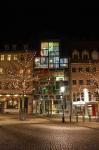 Hologram facade in the optic city of Jena. A day and night walk in light sculpture. The Glass facade is always changing in the eye of the viewer as he or she moves across the market square due to the changing angles of view in relation to the angle of the sun. The use of different types of glass used increases the visual enjoyment. The concept creates a unique spatial experience of unending layers of lightrooms and moments. The historical building dating from the middle ages is transported into the future and is given a new lease of life.