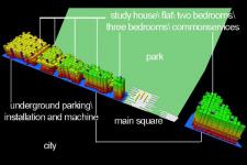 The building is the exponential growth in the X, Y and Z are two types of housing blocks which are articulated like cubes stacked together to achieve a high and as big as it allows the site.