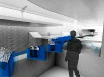 By having the kitchens of housing units and the warehouse share a refrigerated space, this prototype radically exposes the private side of people`s daily lives to the public. The retail and wholesale program adopts the `cutting out the middleman` business model which shortens the food supply chain. The installation of a conveyor belt not only minimizes waste by serving in small portions but also examines the notion of movement, display and spectacle. Translucent refrigeration curtains subdivide the refrigerated space into microclimate zones.