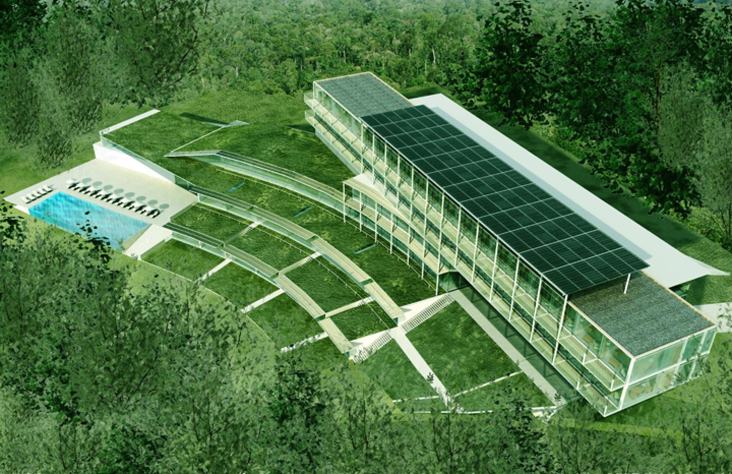 The 160 000 sq. ft. hotel is part of a larger addition, remodeling and renovation project for Mountain Resort and Spa complex, located in the picturesque Rodophe Mountains in Bulgaria. The building will accommodate 60 hotel rooms and 12 private recreational residences with common amenities. The public spaces {restaurant, spa, swimming pool, small conference center} and the private residences are following the sloped terrain, while the hotel rooms are forming a glass bar flying over the terraces. The roof top bar/café reveals stunning views towards the surrounding mountains and centuries-old forest. The photovoltaic array and the geothermal well system are just part of implemented program for energy preservation and represent the environmentally conscious design approach towards sustainable architecture.