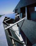 The design concept for the Stealth originated with a requirement for the excavation and removal of toxic earth on the west street front of the formerly industrial site. One of three contiguous warehouse structures, forming a single working space, was demolished to provide ground access to the area where the polluted soil was to be removed. A concrete block wall was constructed to enclose the two remaining warehouses on the east, and the Stealth was constructed to the west, against the new wall. A portion of the excavated area, underneath the overhanging new structure was re-graded, and landscaped forming a sunken garden and meeting space, six feet below the sidewalk elevation.