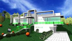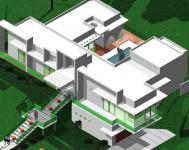 This split level custom modern house was designed by Oscar E. Flores and meets the needs of the topographical lot and also takes advantage of the beautiful green hill country views. This 3,500 sf. living space has a "U" shaped layout and sitting on two acres with floor to ceiling glass walls and doors.