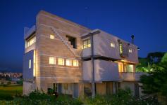 On the outside the mass of the building expresses the threefold composition of the layout. The openings on the south facade are limited in number whereas on the north side they are more and larger. The use of Cyprus stones on the south façade, in contrast to the rest surfaces made from exposed concrete and from plain plaster, renders the “screen” concept of the composition through the use of vertical walls.