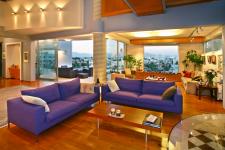 The entrance of the composition, with its high ceiling is an architectural element with multiple uses. It is of central importance to the composition as it gives brightness to the bedrooms allowing them to be an integral part of the residence, and it connects both visually and functionally the whole residence. Apart from the furniture, in the main living room there is a large file place on the east side and the semi-circular staircase located centrally.