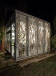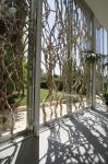 In order to accentuate the ephemeral qualities of this addition in the garden, the shading device that was built to protect the south east façade of the extension was designed as a screen that is operable to allow maximum vision of the garden during periods of inclement weather, and maximum shade during the hot season. The screen belongs as much to the garden as to the kitchen. In view of this, it was decided to create a vegetal surface, made from hemp and flax, which has a strong tradition in the long history of rope making for sea vessels. This material withstands harsh external environmental conditions; it is environmentally friendly, visually rich and engages the senses of touch and smell. The forms that have been created by French artist Aude Franjou also play on the natural qualities of the material. The technique adopted for the sculpture is a variation of a tapestry weaving tradition and involves twisting a flax strand around a heart of hemp, the desired curvature of the branch being derived from the tension applied by hand during the process. It is then woven onto a folding steel frame. Like trees growing out of the ground and spreading their tentacle-like branches over the glass surfaces of the kitchen walls, this contemporary sculpture creates a dialogue between the garden and the kitchen, belonging as it does to both the mineral and the vegetal world.
