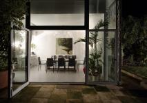 This pavilion-like structure, that houses an extension to the existing kitchen in an eighteenth century house, is made of aluminium and glass. It is aligned with a colonnade of slender steel columns that support a fabric awning providing shade for outdoor dining. Because of its contrasting materials and construction technology, the extension, that is designed like an over-scale porch, does not conflict with the stone walls of the existing house and, together with the canvas canopy, it creates a light and airy screen to the back of the house.