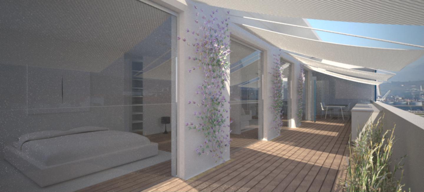The connection to the upper terrace will be reinstated with a cold internal staircase: a patio with staircase that brings in light to the apartment and works as a solar chimney for ventilation in hot summer days, design choice is also dictated by an economic factor, as it avoids the construction of an external glass box, which can be difficult to obtain approval according to the constraints of building regulations. It also reduces the glass surfaces to a single internal crystal glass surface, which divides the interior of the apartment from the exterior / interior of the patio staircase.
