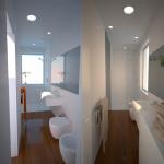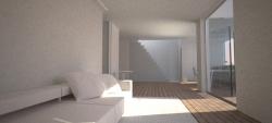 The generated idea was to replace the vacant space of the corridor with an entire element that incorporates all the services of the home {storage room, secondary bathroom, changing room, main bathroom}, and creates a unique environment between the kitchen, living room and bedroom, expanding the living space to the terrace. The two glass boxes have been recuperated in their original volumetric but integrated in appearance with the façades of the apartment. Both have a prefabricated steel structure that will be buffered later in the yard.