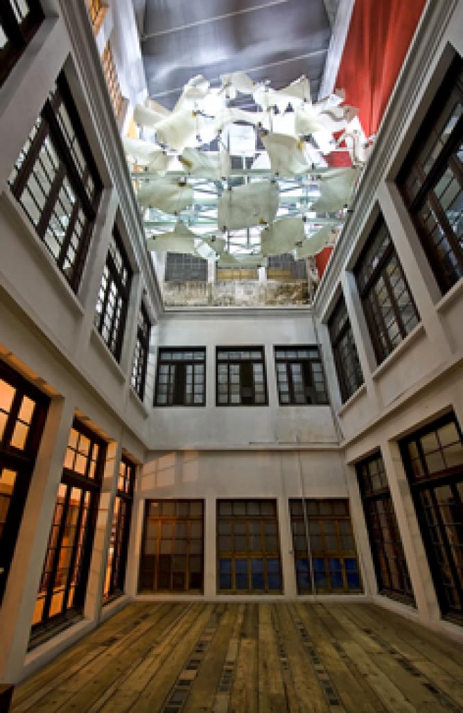 This glassed bridge with a parametric skin connects two halls inside the former Post Office Building, one of the most important heritage structures of Guatemala City, The project also transforms a former inaccesible light shaft into a scenario for various activities and performances.