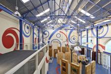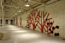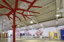 : The project posed a challenge of adaptive reuse of industrial warehouses that predated independence to a modern retail condition. While our solution defers to the historical context by retaining and revitalizing intricate metal and woodwork, it is bolder in attempting to tame the cavernous halls with out of scale embroidered patterns that reiterate the graphic quality of branding logo and colours. Similarly, a tree growing out of the front façade of a structure is evoked in 20 feet high AutoCAD tree stencil cutouts of plywood and pasted to inner walls.
