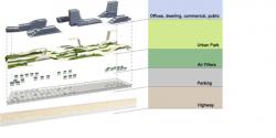 The Highway Habitat project proposes a clever use of these valuable areas. The built mass connects both parts of the city split by the traffic artery by means of a continuity of buildings and open spaces. This plan provides the city with a system of green spaces for the inhabitants, public facilities combined with habitation, workspaces and areas for commerce and leisure. This mixed-use strategy is a key ingredient for creating a sustainable environment, made by planning a complete system with a variety of functions that contribute to a socially-advanced community, creating round-the-clock activities and notably reducing the need for transportation.
