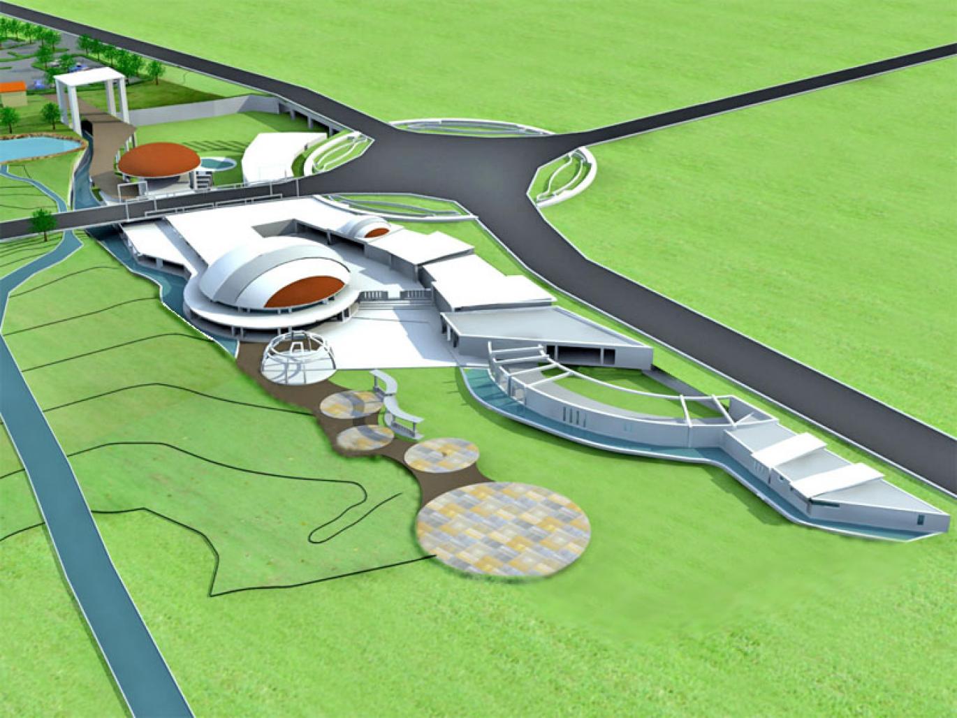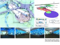 The project involves designing an aquarium complex in a unique site divided by a road which runs across the site prompting a tunnel structure partially earthbermed housing about 225 exhibits.