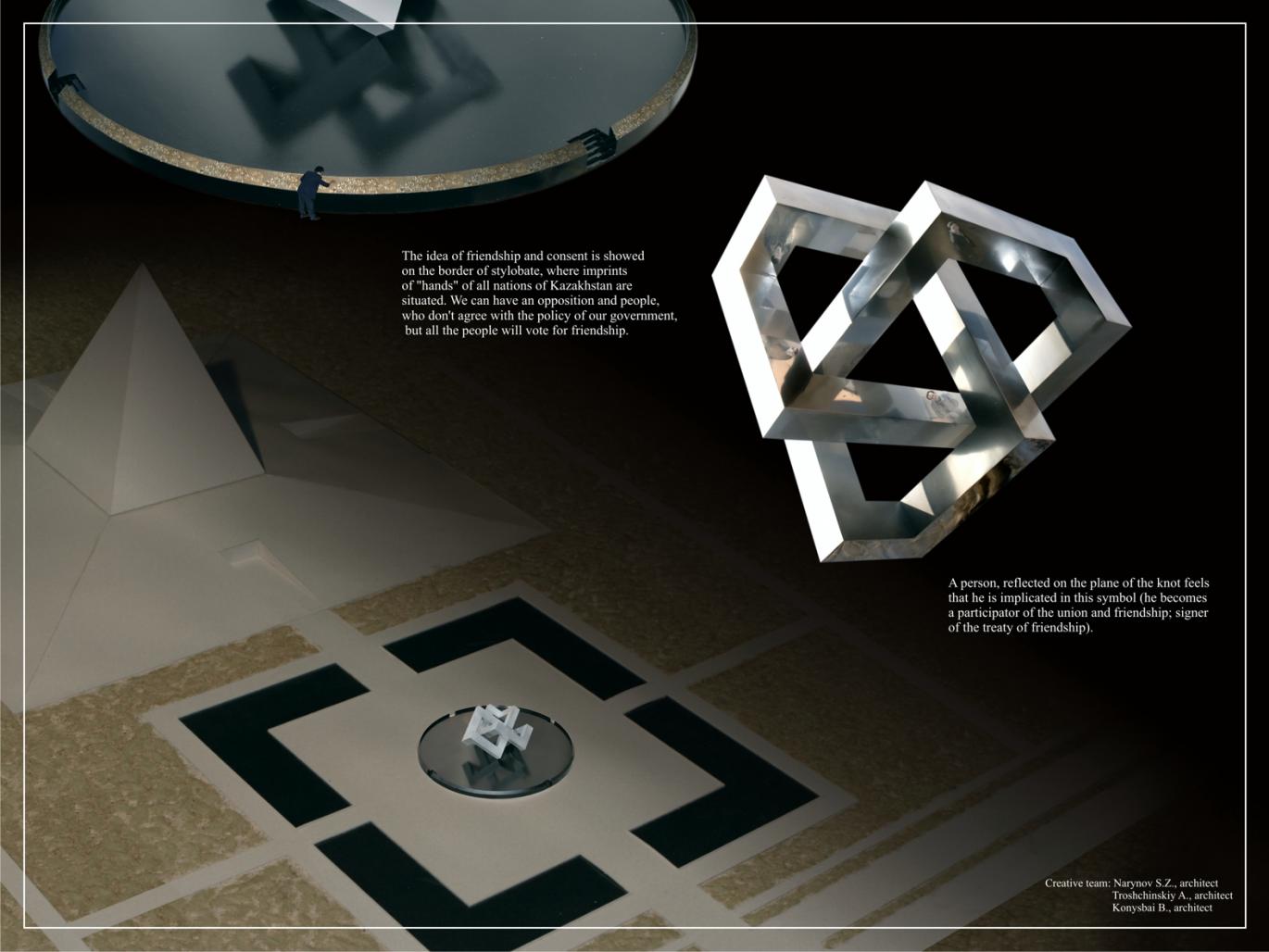 Our knot symbolizes friendship, consent, union of the all nations of our country. It is architecturally distinct, strict and beautiful. Some kind of mystery and complexity presents in it. To the person, standing in front of the composition it seems, that the knot consists of two or even of three knots, but then he discovers, that there is only one knot. A person, reflected on the plane of the knot feels that he is implicated in this symbol {he becomes a participator of the union and friendship; signer of the treaty of friendship}. For Kazakh people this knot has one more meaning – it has three branches, but it is indivisible and integral, like three “zhuzes”, which make up indivisible Kazakh ethnos, where all people equal and united.