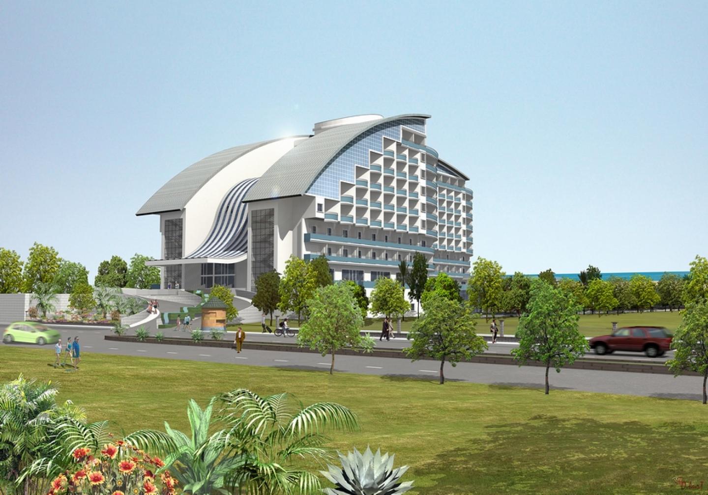 A city resort in Lara Beach of Antalya with 350 rooms. Its main characteristics is focused on the rectandular planned atrium covered with a semi-glass undulating construction between the two sides of rooms and panoramic elevators in the center.
