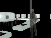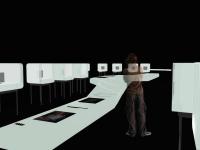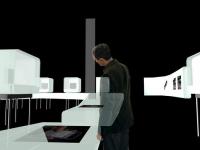 The proposal for the installation of the launch of the Apple iphone in Milan is conceived as an exhibition of historical products of Apple and Macintosh commercialised since their birth. The ending final part of exhibition is dedicate exclusively to the iphone. In order to give the informations to the visitors, according to the shape of the gallery hosting the event and at the some time to exhibit clearly the products, a ribbon-shaped volume is conceived; aside the ribbon 60 boxes contain an display the historical pieces of the collection. The ribbon-shaped volume carry graphics and plasma screens displaying informations and commercials and is lit from the inside. The boxes shape reminds the design of the last generation Apple products, still interpreting it in a consistent way with the project conception. Both the ribbon and the boxes are built with white plexiglas except for the vertical sustains that are built with steel. Because both the ribbon and the boxes are lit from inside the walls of the gallery are painted of black, so just the info and the products are visible. The installation is supposed to be built in the summer 2008
