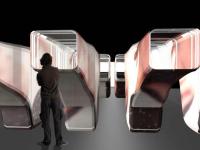 The Binoculars themselves, built with semi transparent and translucent material and lighted from inside by the video projections were changing their appearance even from outside, defining a continuously mutating environment.