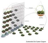 The outer spiral features a sustainable wildflower screen. The screen is a self-standing structure comprised of an array of small-scale tetra shaped pot holding hoops. The double-skinned screen enhances the buildings energy-saving performance through features such as seasonal daylight control by varying pot arrangement, water irrigation systems, and living machines. The entire operational area becomes a greenhouse enclosed in a glass skin and PV panels. The screen also acts as a vertical display adding an organic texture to the building by arranging seasonal wildflowers along the exterior skin.