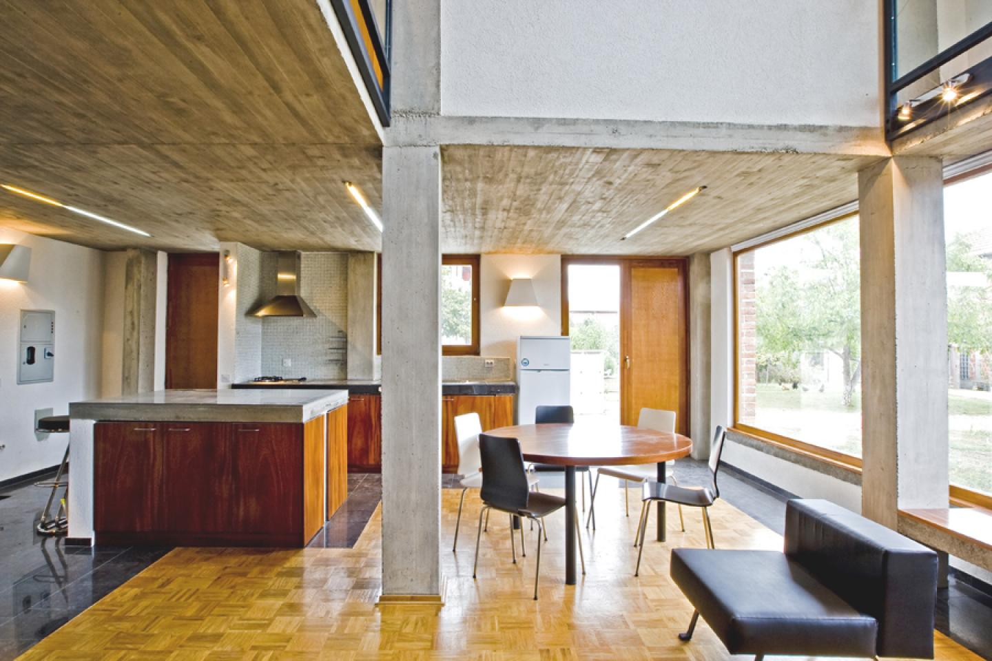 Small house, with brick outside and concrete structure inside. While the outside is retained the inside is generous, full of light and flowing space. The plan somewhere between Plan Libre and Raumplan is based on the unity of structure and space. Particularly low budget and low-tech applied but with very poetic result.