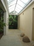 A new building within an existing campus which principally housed the production unit of Auroville Papers that manufactures handmade paper & related products. Originally the designers & administrative staff operated out of the chaos of the production unit & the main brief was to provide a tranquil, focused, uncluttered space to them. The new building has been designed in a very minimalistic and rationalistic manner amply lit by skylights in every space so that artificial lighting is never used in the daytime. To further add to the zen atmosphere, the front windows start from the floor level with miniature dry pebble & rock garden exactly at the window level. The entrance is marked by a perforated skin wall that partially encloses the passageway & a translucent polycarbonate roofing that provides the transition & diffuses the light before one enters the reception area. The landscaping around is also simplistically done in the same line as the building itself.