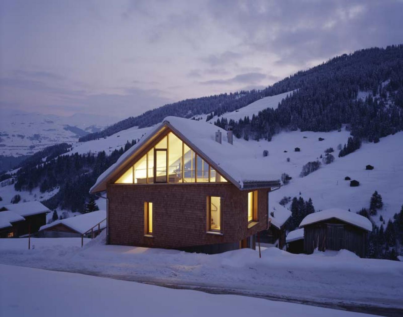 This Week-End-House in Panix, Pigniu in the Swiss alpine region Surselva is at 4300 feet altitude. It`s spaces are connected in a spiral movment, divided by different levels of the rising spiral. The outside wall is wrapped around twice, like a continuous skin - changing from concrete to wooden shingles.