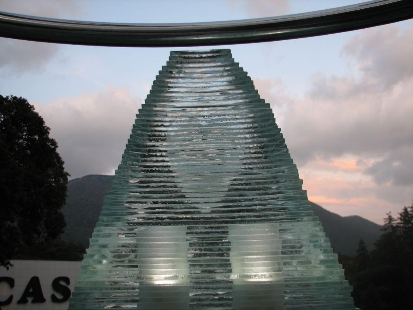 The structural polished stainless steel pipes mirror the nature surrounding the chapel, at one hand. At the other hand, the use of the most transparent stack-up glass slabs ascending in a helical fashion let the eyes of the visitors travel beyond the presence of these same glass slabs that generate a soft and entertaining translucency.