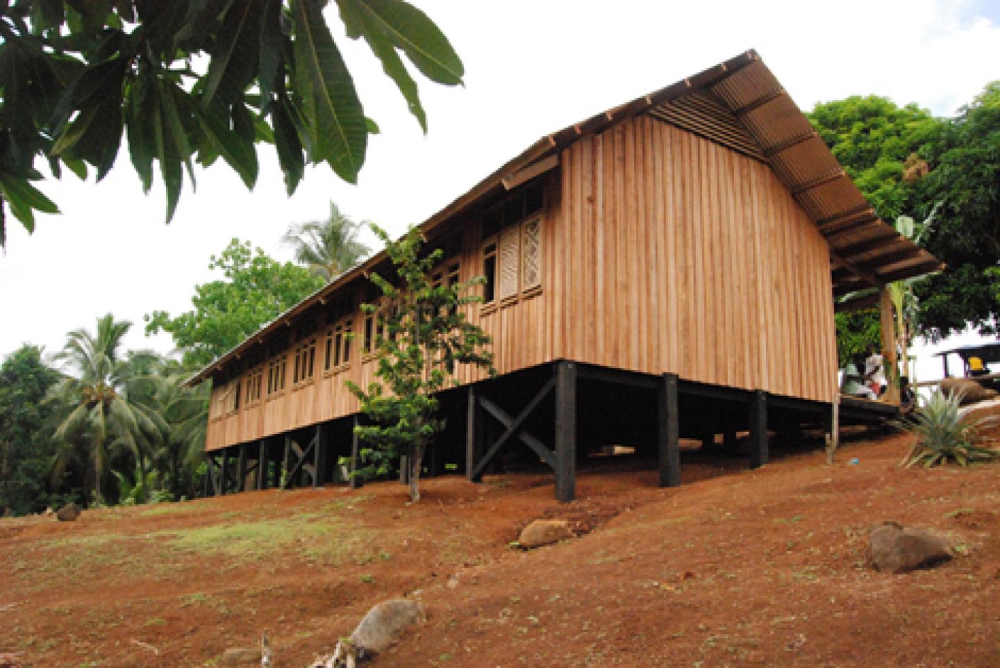 Emergency Architects was originally approached by the European Union and the Solomon Islands Government to provide simple, appropriate, sustainable designs for the 130 schools affected by the disaster. The brief was to produce a suite of building designs that could be used for the various functions of a school in remote regions of the Solomon Islands, places that can sometimes only be accessed by boat or foot. The buildings had to be easy to construct using local labour and materials and had to be earthquake resistant, naturally lit and well ventilated. The building is made entirely of timbers cut on site and the windows are made locally from hand woven fibre.