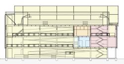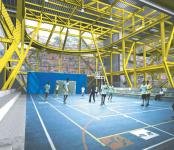 The 1,000 square metres site for the Vertical Gymnasium, located in Bello Campo, Barrio La Cruz, transforms the site of a former soccer field into a fitness complex with basketball courts, a dance studio, weights, a running track, a rock-climbing wall and an open-air soccer field for this densely populated sector of the city. The previous training facility was located on street level, and due to the densely built surroundings, could not expand out. It had to upwards.