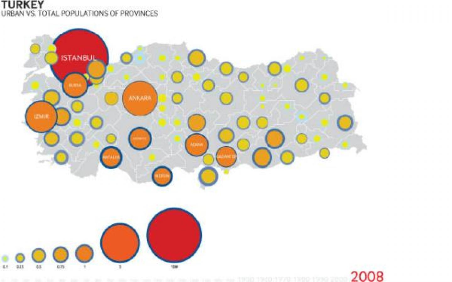 With a population of over 14 million people and a density of 2,400 people / sqkm, Istanbul feels impossible to grasp therefore impossible to control or design. The aim of “Mapping Istanbul” is to initiate a series of visualizations for the city; how many hotels are there in Istanbul, where are they located? How about hospitals, soccer fields, taxi stands...? How are the education levels in different neighborhoods? The occupations, densities? How extensive is the bus network? Rail? Ferries? All are invisible layers, slowly appearing on a white screen...