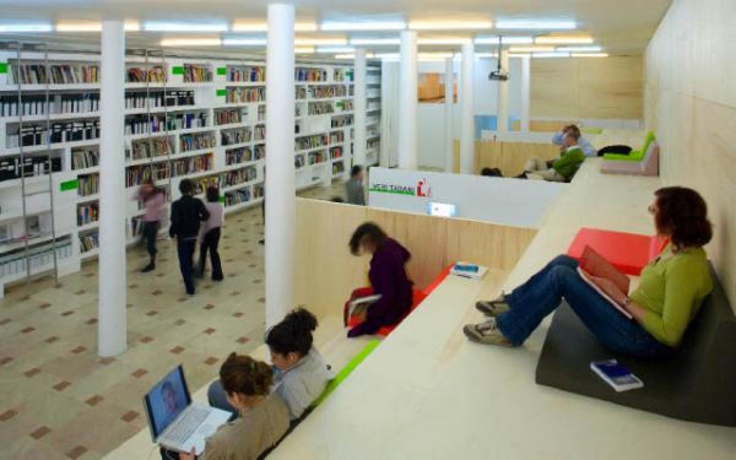 The mezzanine level above the gallery floor is used for more focused visitors in need of a private study zone.