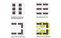 Without sacrificing efficiency of one core to four units, the proposal aims to elongate the blocks to prioritize views to one side. The blocks are then arranged to create a central garden of 8,000 m2; to complete the often neglected green space needs of urban housing.