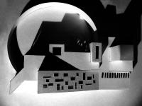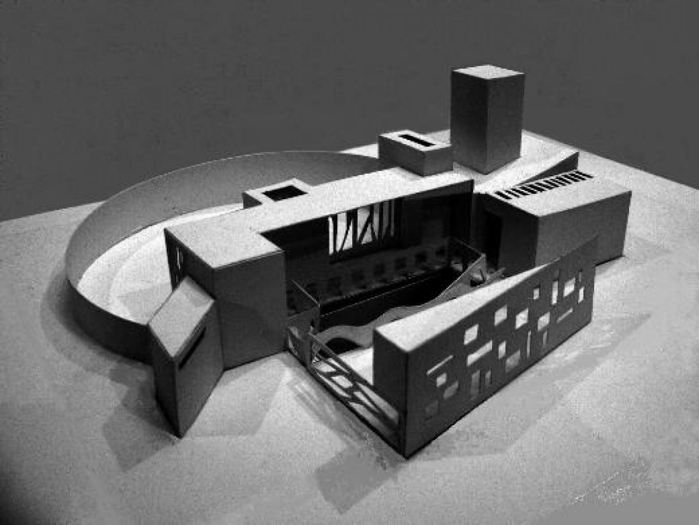 the mass of the penthouse harmoniously. A roof garden is defined with the curved low wall. The first photograph provides a glimpse of the interior with the model