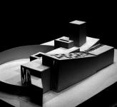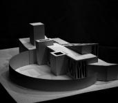 the mass of the penthouse harmoniously. A roof garden is defined with the curved low wall. The first photograph provides a glimpse of the interior with the model