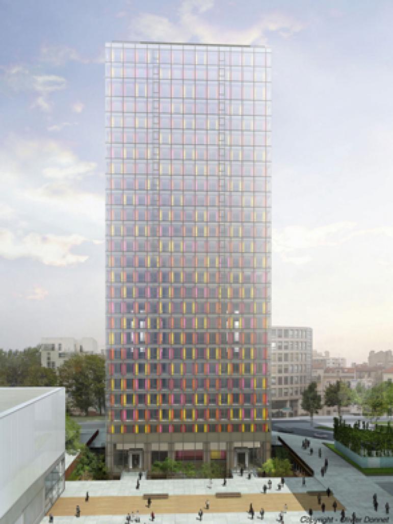 The refurbishment of the URSSAF high rise office block, which was built in the 1970s, reflects the town council`s desire to revitalise the town centre: a theatre, a shopping centre, public spaces and housing units. The outbuildings on the ground floor have been cleared in order to open up the public space that will link the new facilities. The project provides for breaking up the base of the office block with large gardens situated four meters below, thus bringing natural light below. The project proposes modifying the facades, giving an optimistic, gay and colourful appearance to the former prefabricated concrete elements.