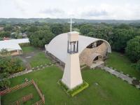 The formal and spatial design of this project is based on the “Vesica Piscis”, an oval shape which comes out of the intersection of two circles with the same radius, intersecting in such a way that the center of each circle lies on the circumference of the other. It represents a fish, which represents Christianity. In Medieval times, churches and temples were designed based on the Vesica Piscis. Thus, in our case, sections of the circle such as those that conform the Vesica Piscis are the formal and symbolic elements used in this project. The roof, the wall behind the altar and the steps to the altar as well as the large stained glass windows use this shape. Besides religious symbolism, we use symbols of place. To accomplish this, we decided to use a local black stone to tie the building to place. The shape of this church also responds to the shapes of the mountains that surround the town where it’s located. The whole building is set in a reflecting pool that symbolizes eternal life. Rainwater that sheds from the roof will drain into this pool, generating water movement and sound, thus provoking a state of meditation among churchgoers.
