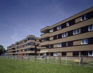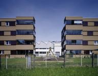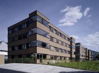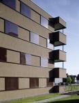 The room program is characterised by a high degree of modernity and appropriateness, which is very new for social housings. The facade presents itself extremely alive. For this primarily the mobile, dark-brown sun protection contributes, which - from screen printing windowpanes manufactured - corresponds harmoniously with the warm brown of the facade rendering.