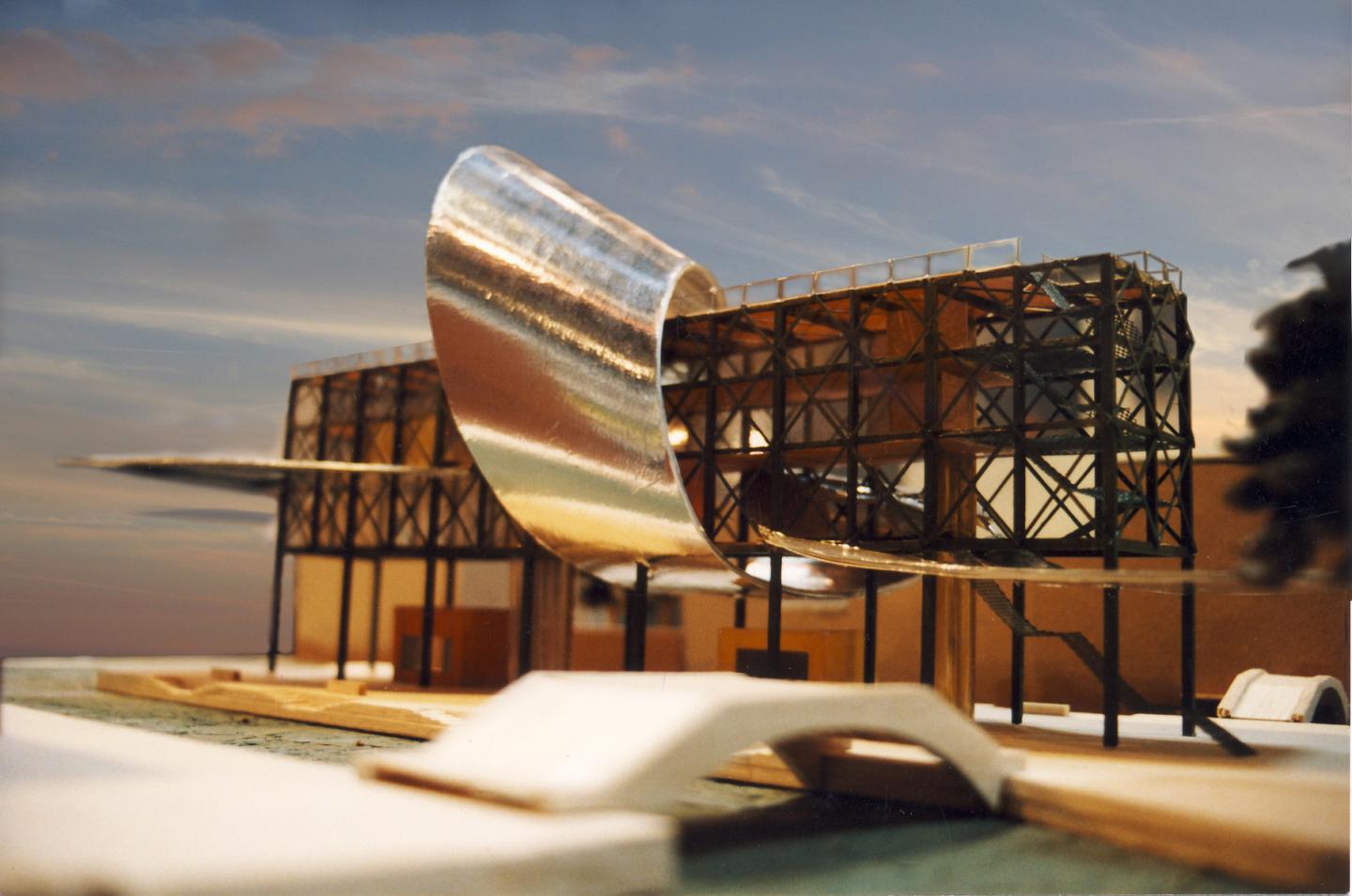 The concept is based on the legend of the Angel {venetian; Anzolo } speaking to St. Mark (Pax Tibi Marce Evangelista Meus...on this spot there once will rise a city....), the Angel is reappearing..., flying through the structure of the slim, but solid building, blessing the city again, its inhabitants, its travelers, its believers of the venetian miracle, and leaving its shimmering path behind, its wings for shading against rain and sun. This non ordinary terminal is to contain restrooms, ticket office, a cafe, maybe a small ballroom, a roof terrace for free, rare in Venezia... I would also like it to contain a big model of the gilded ceremonial ship, the Bucintoro.