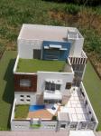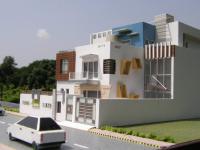 House is consist of four bed room house having modern elevation, front facade is cladded with dholpur stone stair case tower is fully glazed and side elevation there we have some windows which is visible from front all had different shapes by the gud use of colours and material bold and balanced facade is created