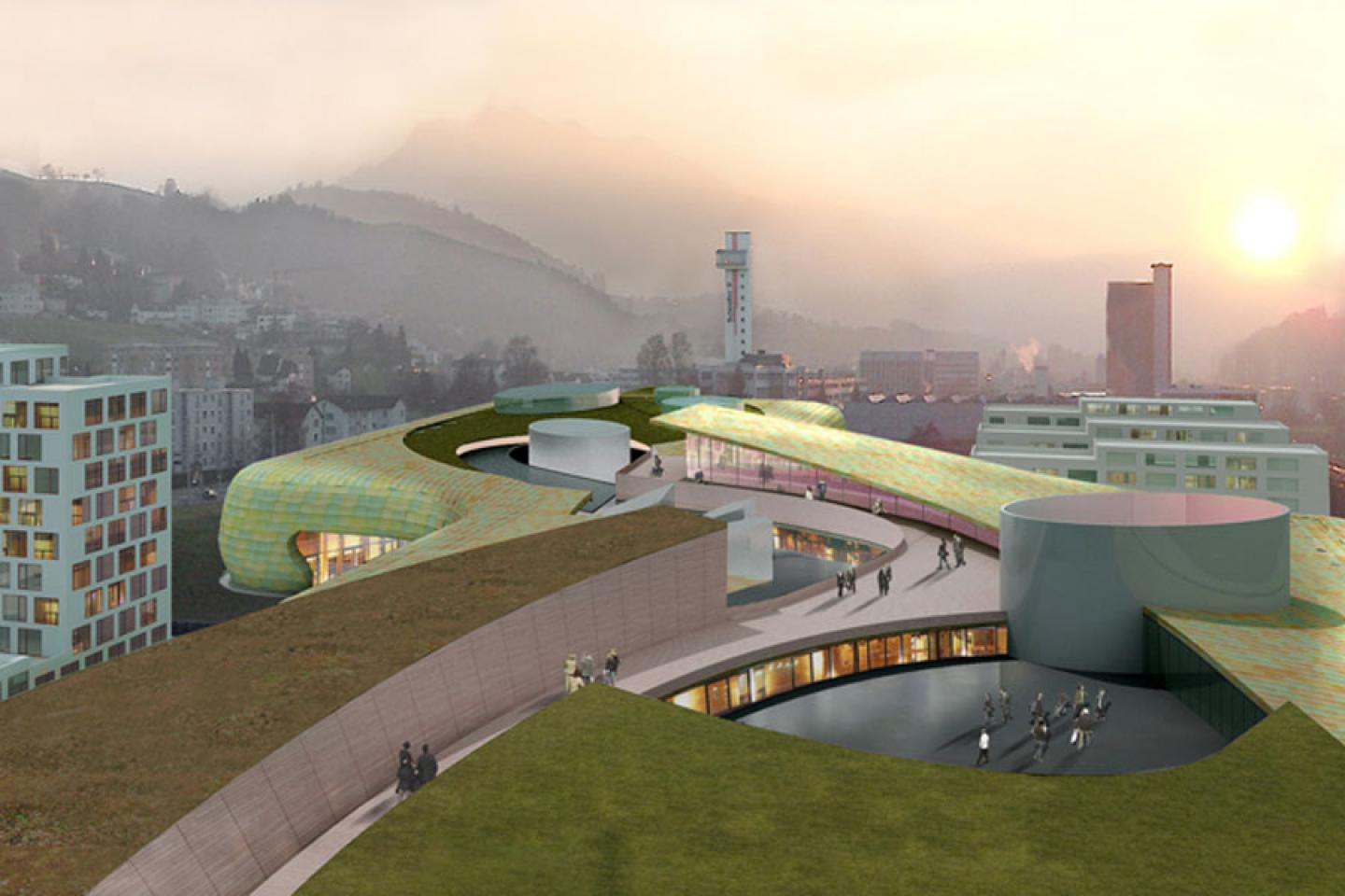 Located in central Switzerland’s Rontal near Lucerne, the large leisure park is an adventure center and mall in one, connected by a newly built stretch of highway. Behind a translucent polycarbonate façade the building is split into two volumes that stand diametrically opposed to one another. The roof landscape featuring plazas, water surfaces and birch forest is a reflection of the figure „8“-shaped interior. A spatial continuum creates an interior landscape that the visitor can interact with. A variety of leisure, entertainment, and consumer facilities are consolidated under one roof and enriched with different attractions and events. Mall creation means allowing intense atmospheres and a unique identity to develop, distinguishing it with a measurable increase in value. Immersion into the world of EbiSquare offers the visitor relaxation, enchantment, and adventure. Sensual fascination is spatial and transformed through media. The visitor is flaneur led through adventure-rich landscapes. Different landscape typologies from central Switzerland serve as models for extensively choreographed sculptural and media interpretations.