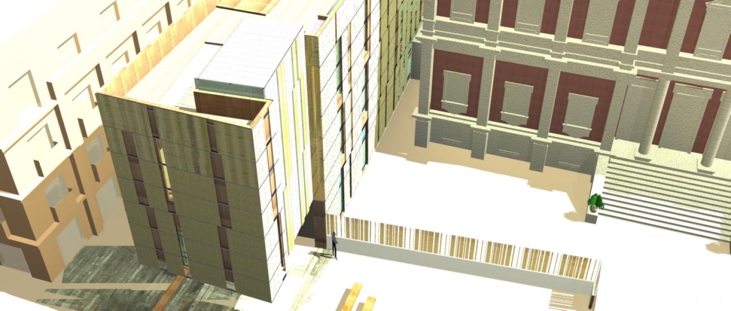 The site has a unique way. Extremely long and narrow, in an urban area highly secure, and as the main element, the "Escuela de Estudios Hiberoamericanos" s) which has a park to the street with spaces interesting.