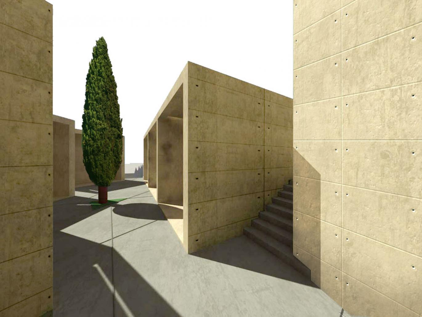 For the enlargement of the complex, we produced a non-linear building, which we made in separated monolithic elements of 4.25x4.25x4.25 that contain 20 burial niches inserted in the down-slope earth organised in a non-homogeneous manner to reduce visible impact.