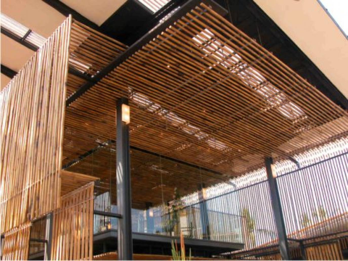 The universal glass technology space concept creates a transparent space, yet one which is redefined by the moveable chapped bamboo partitions, which themselves re arrange to become sliding penetration partitions from the sun.