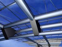 The building structure was solved with a metal pillar in the form of "V" bearing two curved roofs that join to form a double "C" triple inverted rib structure.